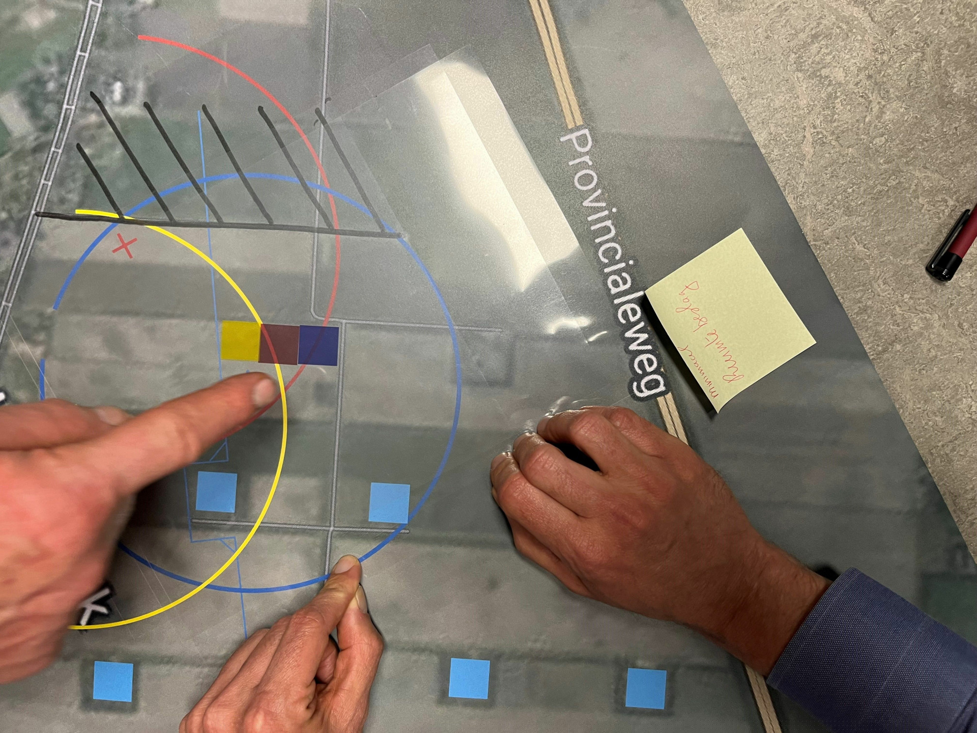 Zo’n 35 omwonenden namen deel aan de sessie. Ze werden in drie groepen verdeeld, waarbij ook steeds iemand aanschoof van Gasunie en Nobian. Met behulp van een kaart en transparante vellen gaven de deelnemers aan waar zij de cavernepads zouden neerzetten en bespraken waarom. Vervolgens werden de voorkeuren van de drie groepen op één digitale kaart getoond en de overwegingen op een rijtje gezet. Bijvoorbeeld het volgen van zichtlijnen in het landschap en het plaatsen bij bestaande locaties. We voegden deze input samen met alle andere belangen en namen een paar weken later een weloverwogen besluit. Uiteraard deelden we dat besluit weer met de omwonenden.