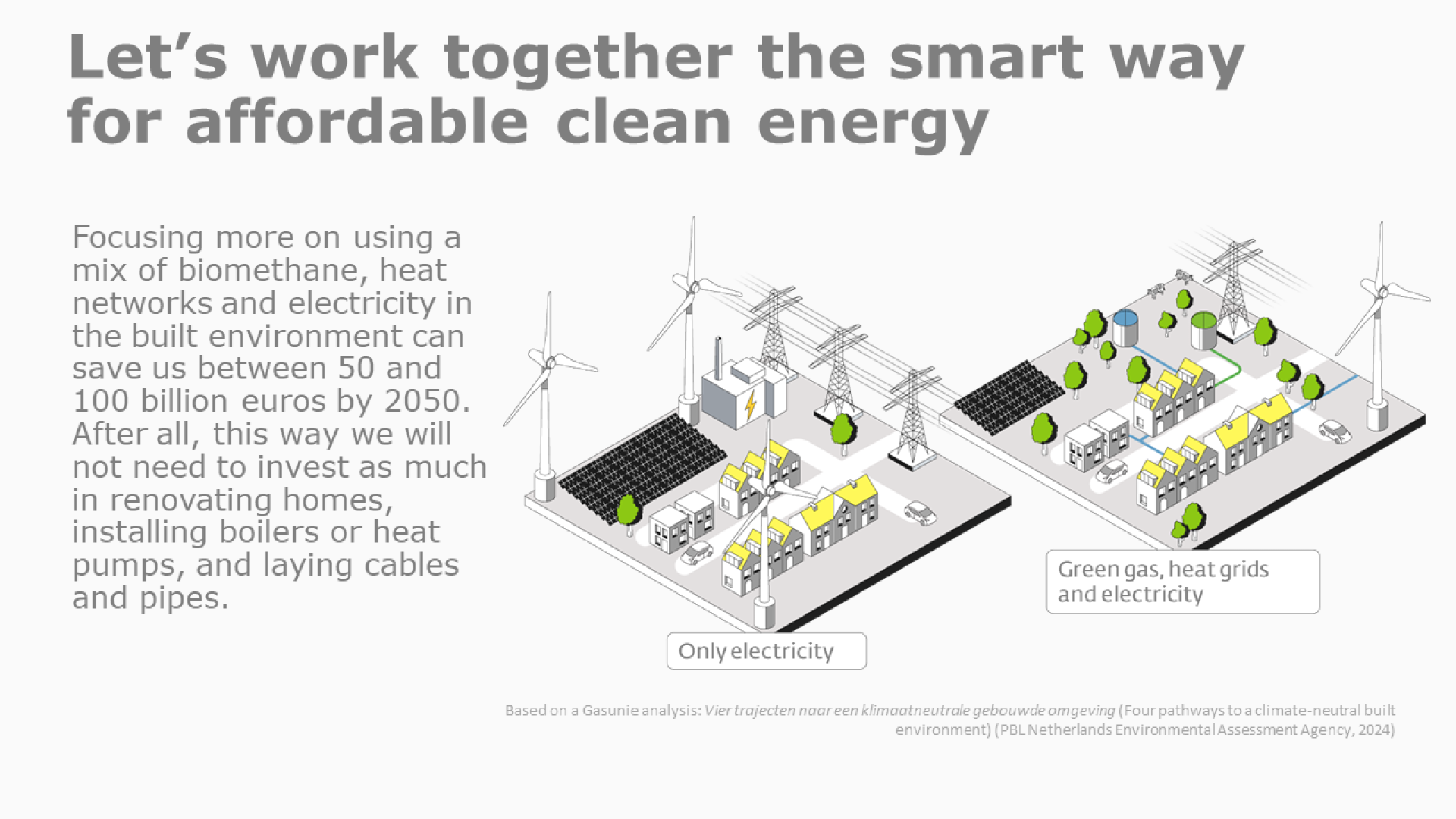 Green electricity will continue to increase, and this is urgently needed, too, for various sectors in society. However, sustainability will go faster and be more affordable if we also focus on sustainable gases. By adding sustainable gases like green and blue hydrogen and (to a lesser extent) biomethane and heat to the energy system, we make the system more robust. We can also produce these gases right in our own region, making us less dependent on other power blocs.