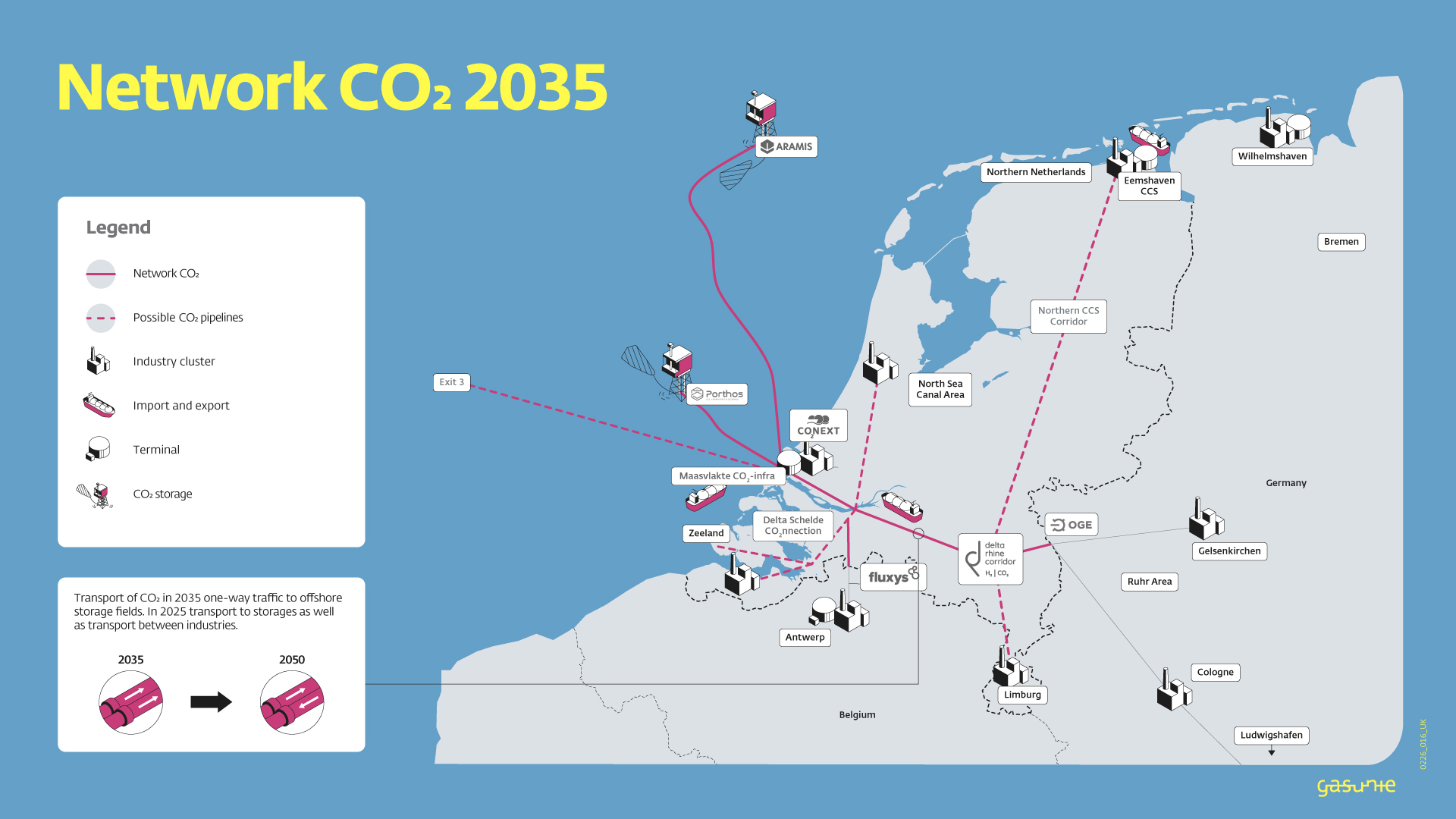 Aramis is a similar project to Porthos, but its annual processing capacity will be 22 Mt, making Aramis one of the largest CCS projects in north-western Europe. Aramis can use the space that is still available in the onshore part of the Porthos pipeline, which can transport up to 10 Mt per year.