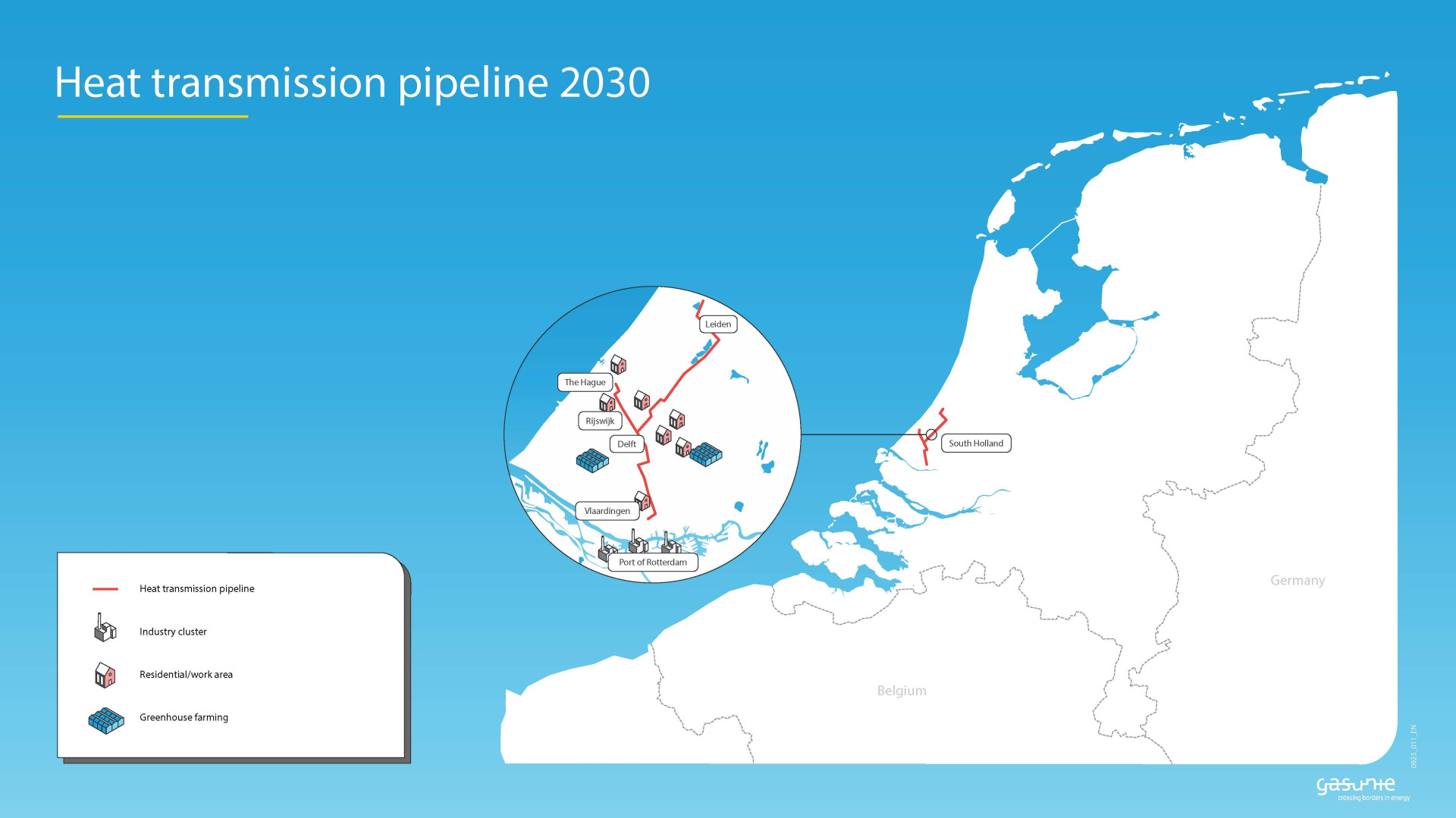 Gasunie is constructing WarmtelinQ, an underground system of pipelines stretching out over 56 km to transport waste heat from the Port of Rotterdam to residential areas in the cities of Vlaardingen, Rijswijk, The Hague and Leiden, as well as other locations. Through this pipeline we will transport waste heat from the Port of Rotterdam that our customers can then use to heat homes, businesses and commercial greenhouses. The total capacity of the WarmtelinQ main heat network will be 250 Megawatts thermal (Mwth), enough to heat approximately 120,000 homes. This will result in a saving of around 0.18 megatonnes of CO2 per year.