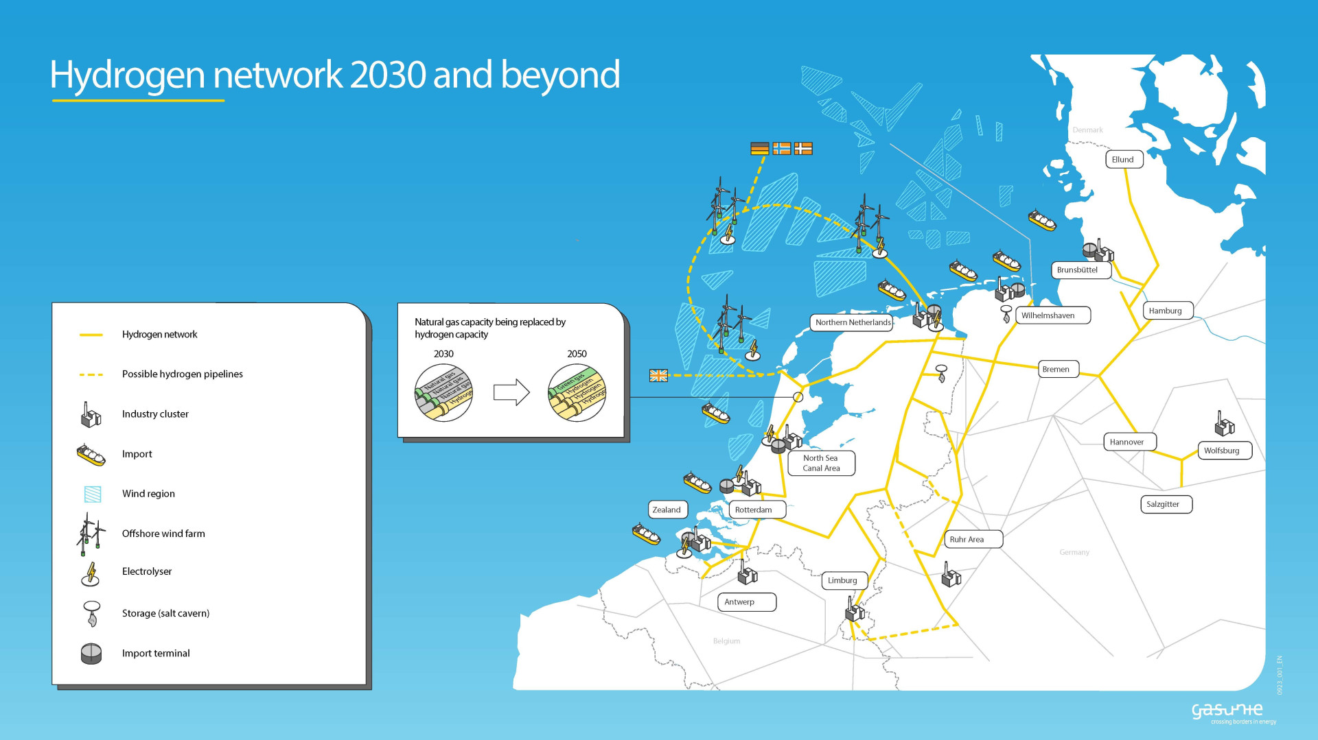 A prerequisite for the development of a hydrogen market is having in place the infrastructure for the import, transmission and storage of hydrogen. The Netherlands and the north-western part of Germany are ideally positioned to serve as a gateway for hydrogen entering Europe.